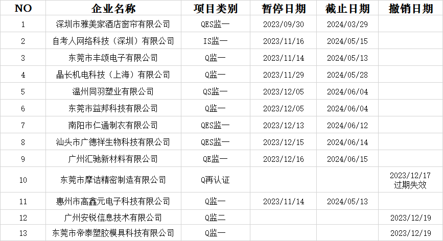 以下客户因没有在规定的时间内接进行年度监督审核,获证组织证书在规定时间内暂停。